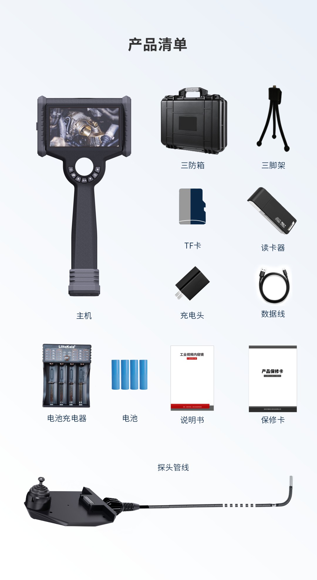 優(yōu)勢特點(diǎn):6英寸高清觸摸屏、快速更換管線、360°全方向擺頭、后置LED光纖導(dǎo)光、18650電池,工作時(shí)長≥8