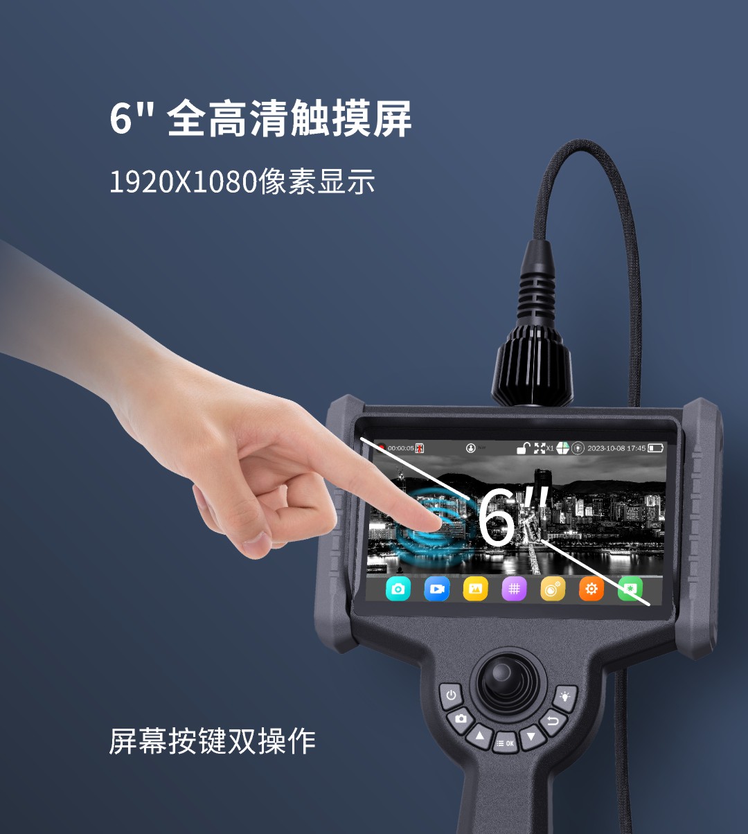 優(yōu)勢特點:紅白雙光源;6英寸大屏;雙電路設(shè)計,單節(jié)電池也能工作;360°旋轉(zhuǎn)探頭