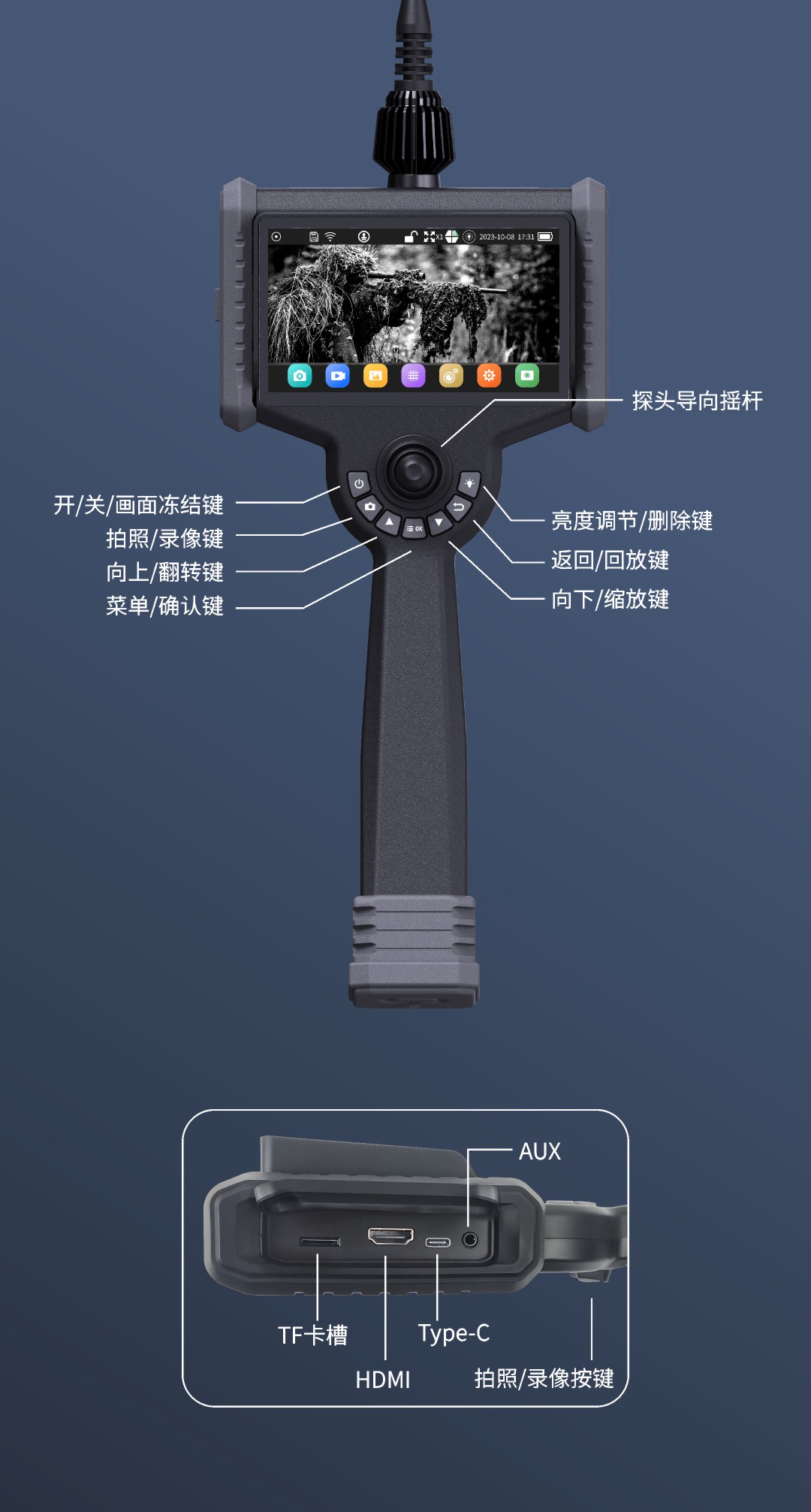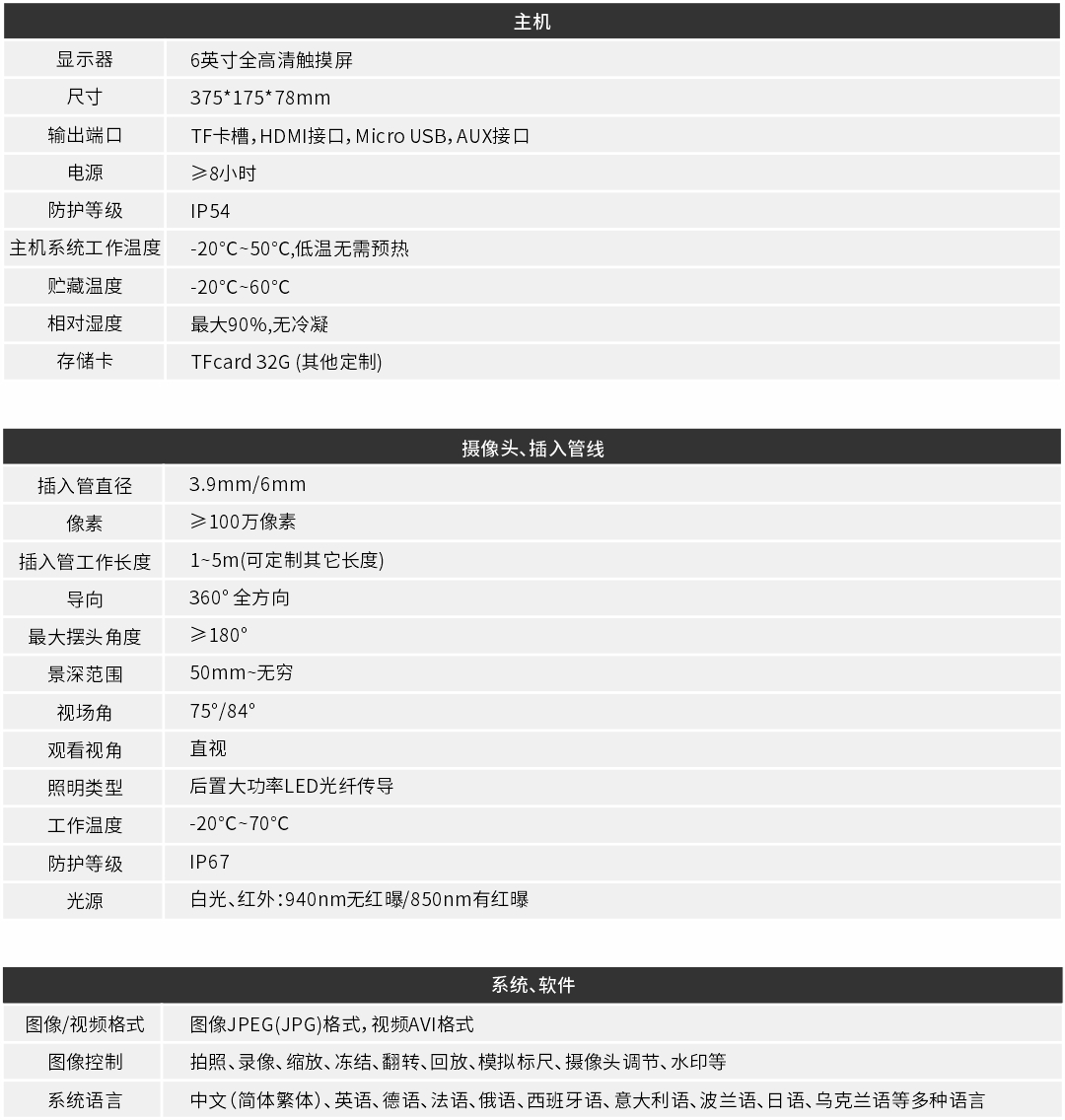 優(yōu)勢特點:紅白雙光源;6英寸大屏;雙電路設(shè)計,單節(jié)電池也能工作;360°旋轉(zhuǎn)探頭